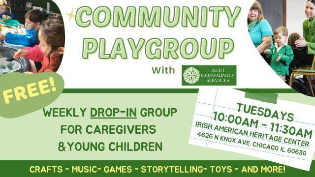 Kathleen Howlett said: Irish Community Services offers a free playgroup at the Irish American Heritage Center. Its every Tuesday from 10:00am-11:30am and is open to everyone, no RSVP needed.